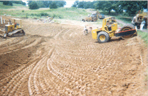 铲土机均匀地铲平土壤为下一步的压缩加密步骤做准备。